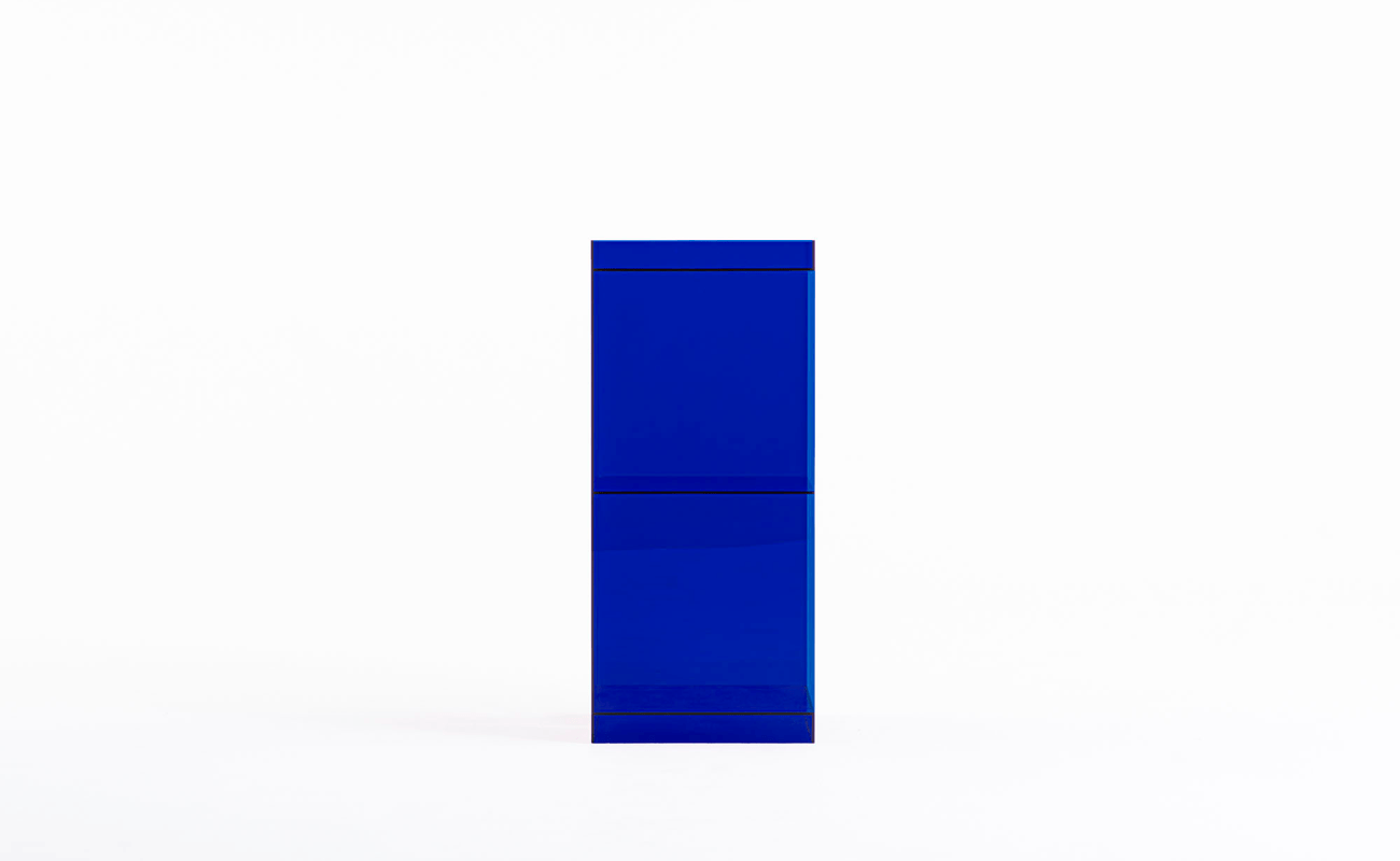 厚さ 5mm の透明なカラーアクリル板を最小限の構成で仕上げ、透過する光と色が交差するシェルフです。接合部が透けて見える透明な素材で、青、緑、紫の 3 色が重なり合うことで深みのある色彩を生み出します。低いタイプはソファのサイドテーブルとして、日常の中でさりげなく機能しながらも、独自の透明感と軽やかさで空間に静かなアクセントを添えます。高いタイプはデスクの横や何気ない場所で、光や周囲の環境を映し込みながら視覚的リズムをもたらすオブジェのような佇まいをもちます。